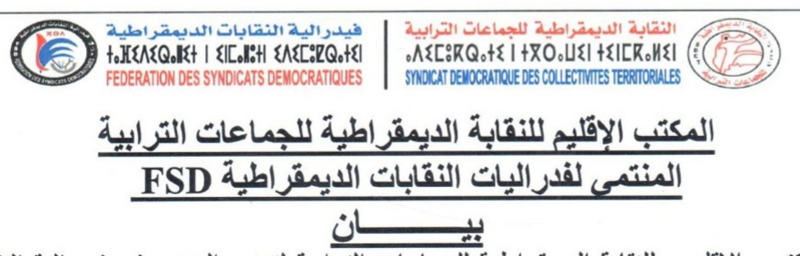 إن المكتب الإقليمي للنقابة الديمقراطية للجماعات الترابية لتنغير العضو في فيدرالية النقابات الديمقراطية / FSD وهو يتابع مجموعة من القضايا الوطنية و المحلية و خاصة داخل جماعة تنغير يسجل ما يلي :