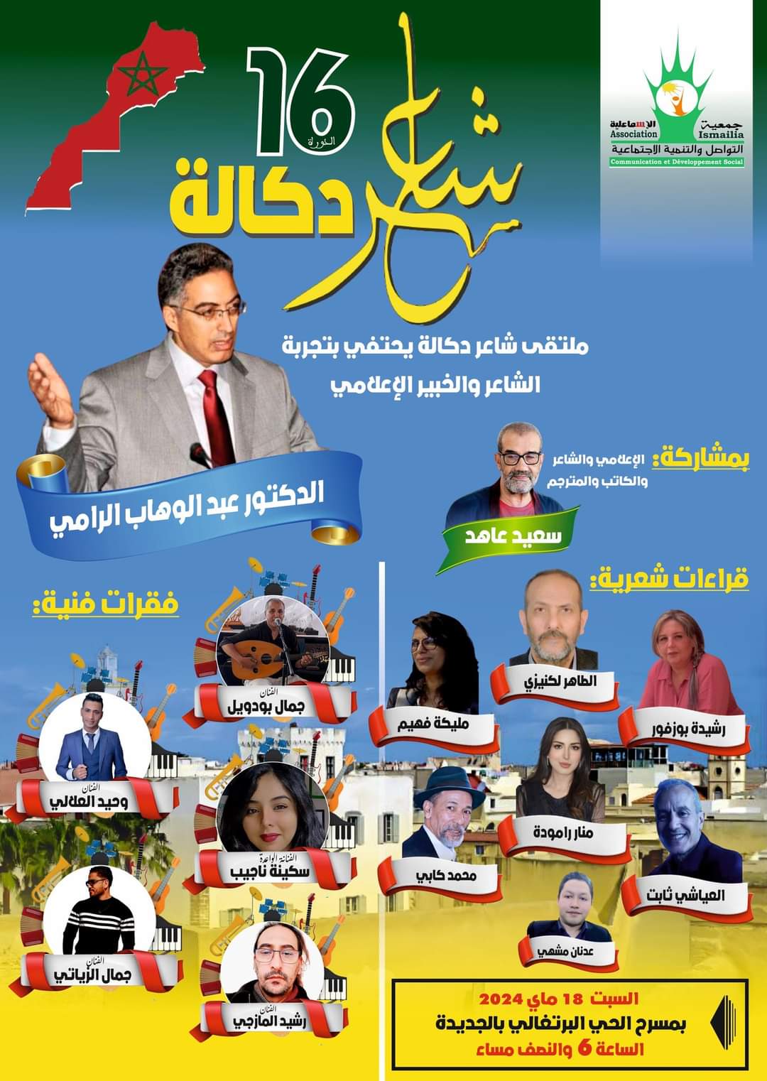 تحتضن مدينة الجديدة يوم السبت 18 ماي 2024 فعاليات الدورة 16 لملتقى “شاعر دكالة” الذي يحتفي بالشعر والموسيقى.
